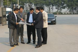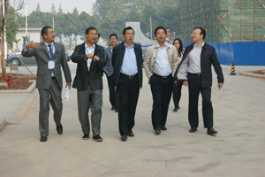 中超集团董事长杨飞和公司董事长杨俊为王中苏一行介绍新建办公楼基建情况
