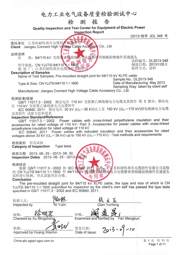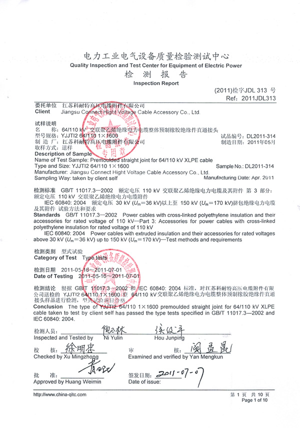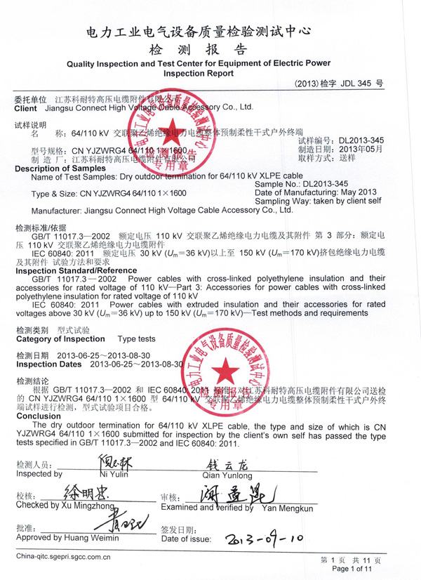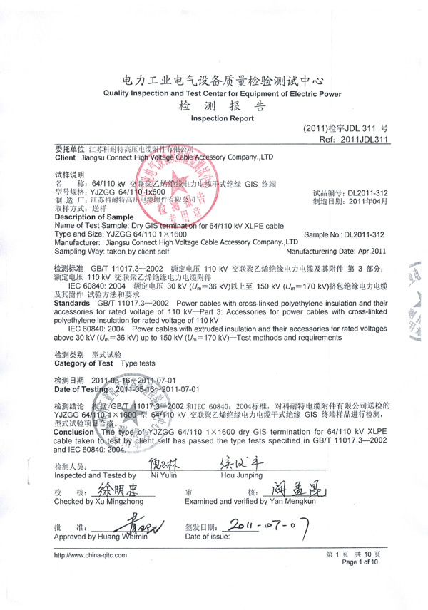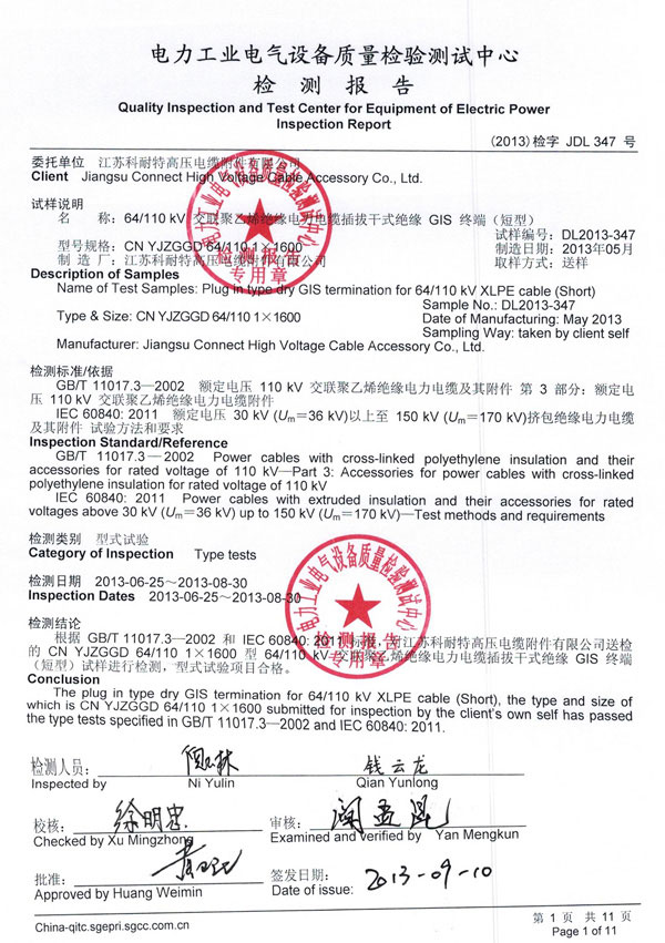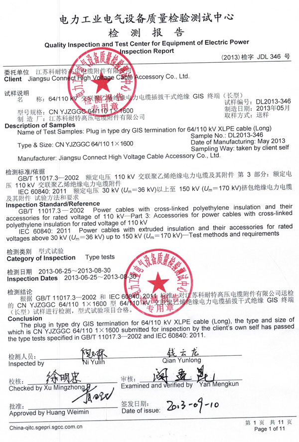 祝贺公司64/110kV系列附件产品全部通过中国电力科学研究院武汉分院检测