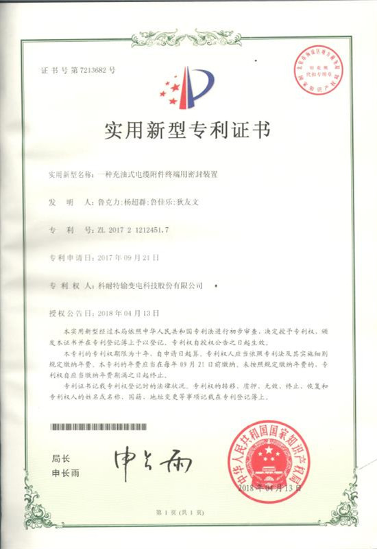 (三)“一种充油式电缆附件终端用密封装置”实用新型专利证书
