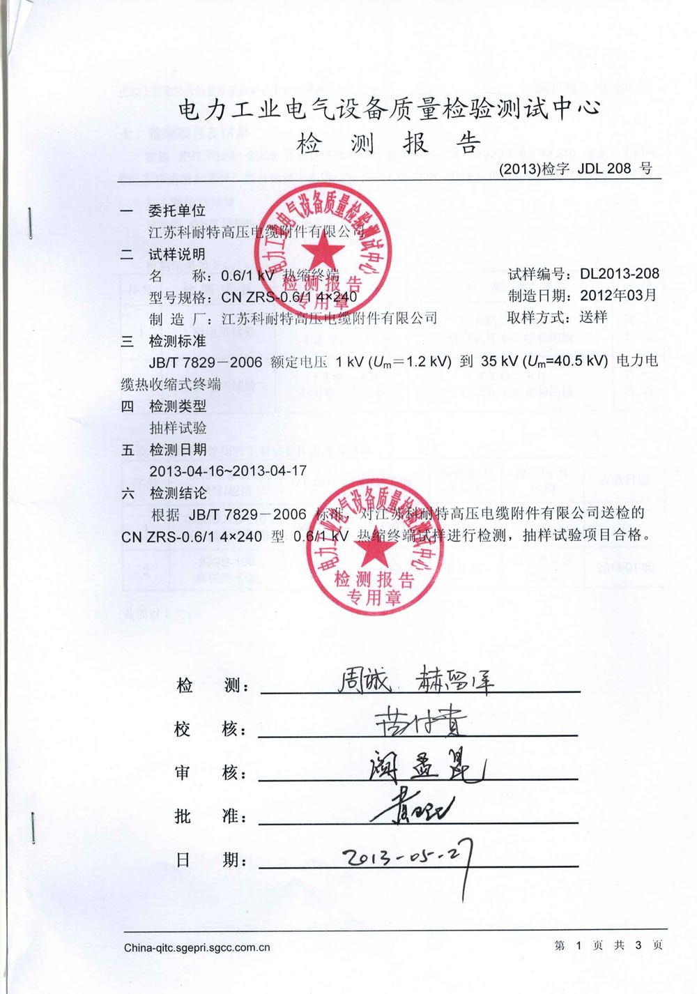 1kV热缩终端获得电力工业电气设备质量检验测试中心检测报告